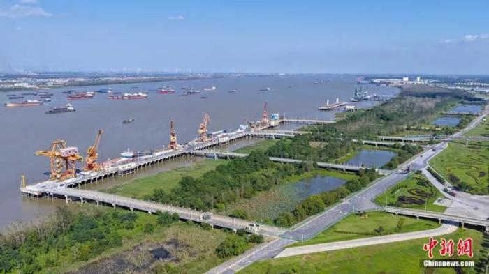 航拍长江江西瑞昌段,江岸绿意葱茏船舶来往不断。魏东升 摄