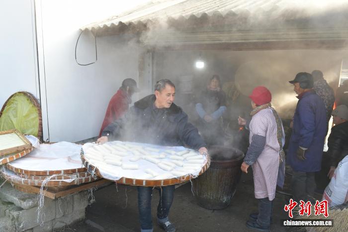 1月8日,在蔡家桥镇朱旺村,村民在搬运做好的年糕。中新社记者 储玮玮 摄