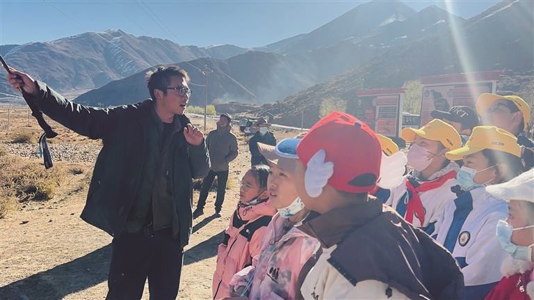 小朋友们在保护中心工作人员李义旺的带领下了解雪豹生存环境。
