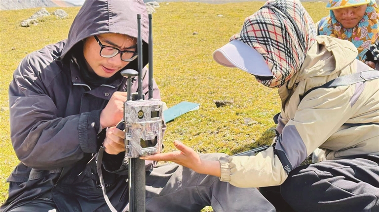 保护中心工作人员李义旺教当地农牧民架设红外相机。