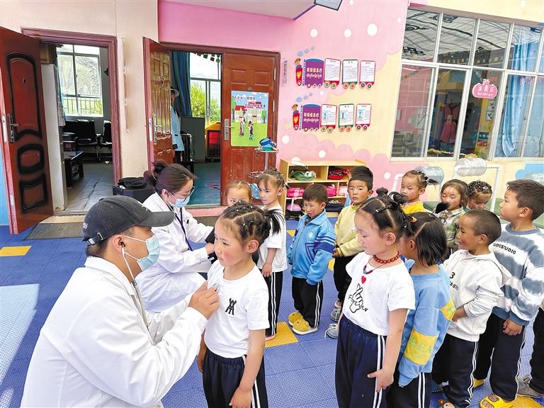 江苏援藏医疗队为墨竹工卡县幼儿园的小朋友检查身体。
