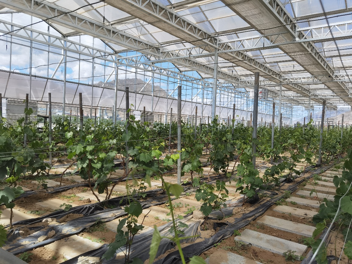 河谷北岸,高山脚下,成片的葡萄露天种植区和光热大棚,沿着河滩密布,规模已近万亩。