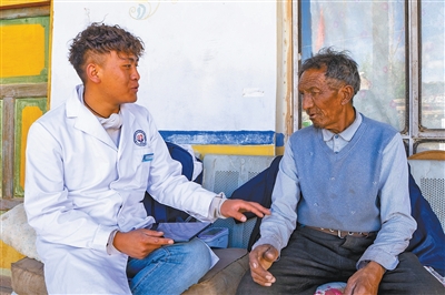 走进大门,他一边和老人寒暄,一边从包里拿出血压计。“这两个月血压变化不大,咱们还要继续保持健康生活习惯,不要吃太多油盐。”量完血压,索朗丹增细细叮嘱。