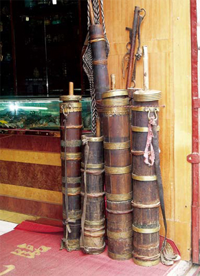 打茶的隆隆声一般从早晨八点断断续续响到上午十点左右,也即最晚的早餐结束时。酥油茶就糌粑,是绝大多数藏族百姓早餐的定式。没有这香浓滑润的酥油茶,那有些干涩的糌粑怕是难以下咽的,尽管现在越来越发现糌粑是很好的保健食品。酥油茶的制作很简单:在专用搅拌机中放入适量的盐和酥油,再加适量开水和少许提前熬制的浓浓的砖茶汁,充分搅拌至完全融合,呈乳白色的液奶状,再倒入壶里适度加热(此处的诀窍是绝不能煮沸,否则,酥油与茶水会重新分离,互不粘连,变成清汤寡水),如此,一壶滚烫香醇的酥油茶就做好了。