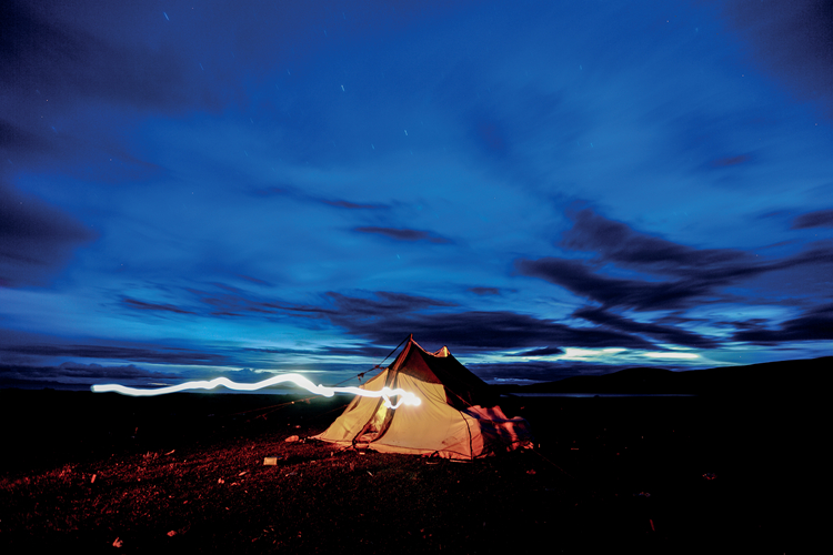 蓝色的天幕之下,被牛粪火光映红的帐篷。
