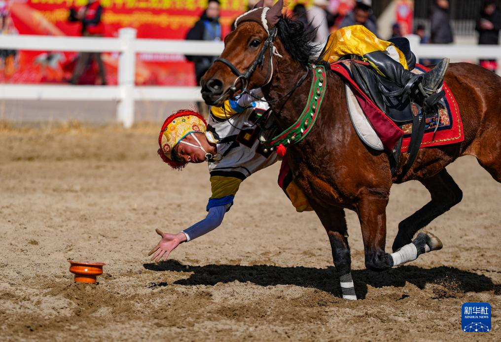 3月2日,马术队员在表演传统马术项目捡碗。新华社记者 晋美多吉 摄