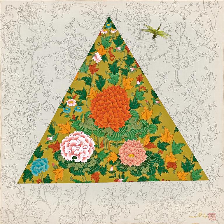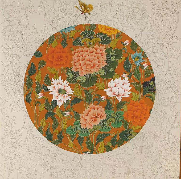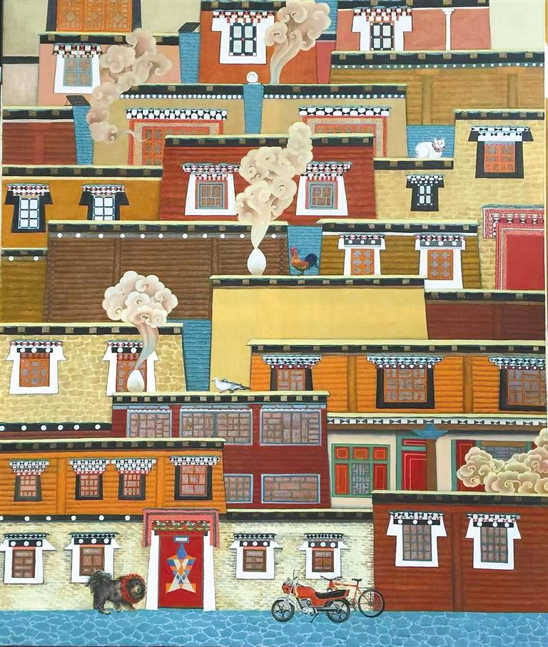 “我喜欢把传统的壁画、唐卡里的花卉等元素表现在作品中,其次将这些元素进行当代转译,通过布面重彩的形式重构叙事,最后注入对西藏现代化进程的深度观照。”拉巴次仁说,“这种创新不是简单的符号拼贴,而是要在吃透传统技艺精髓的基础上,像青稞扎根土壤般从西藏本土文化中生长出当代艺术语言。”