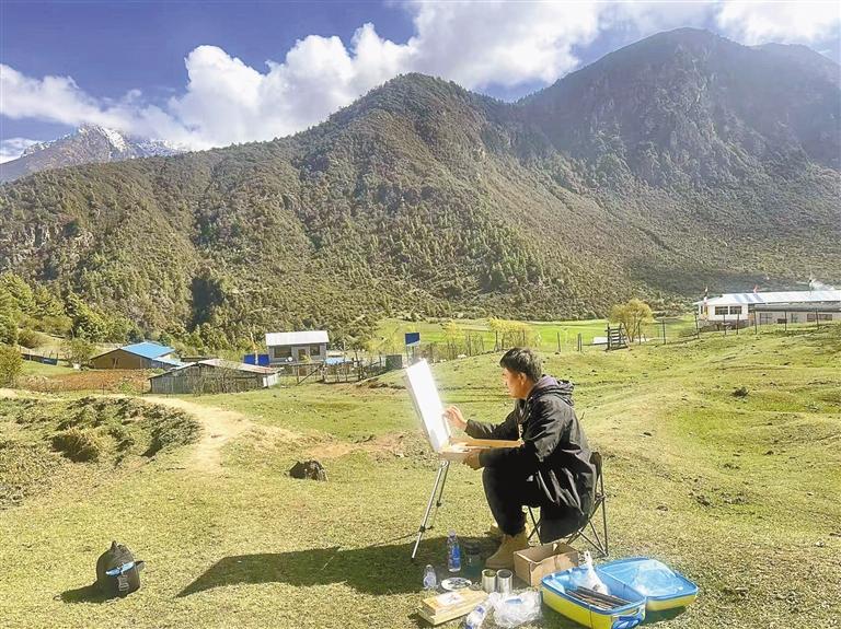 拉巴次仁在千年古镇吉隆沟扎村写生。