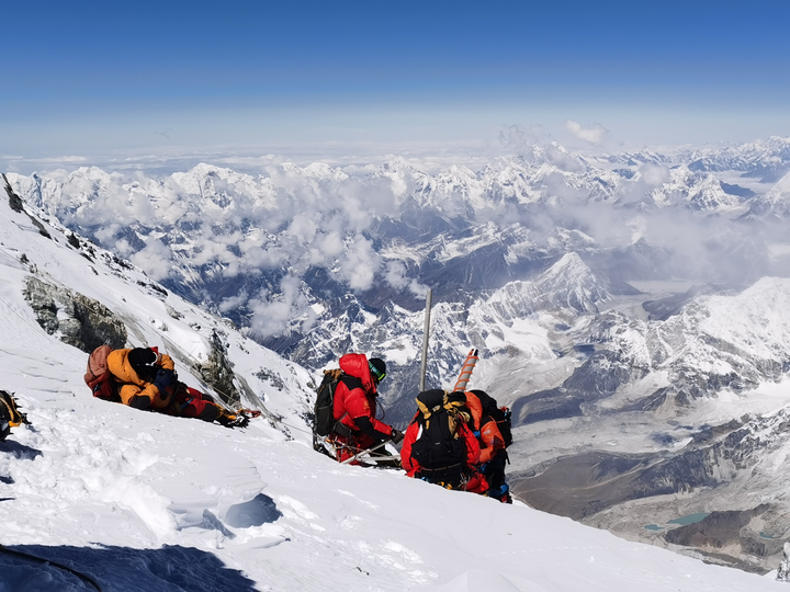 2020年5月27日,2020珠峰高程测量登山队成功登顶世界第一高峰珠穆朗玛峰。他们在峰顶竖立觇标,安装GNSS天线,开展各项峰顶测量工作。新华社特约记者 扎西次仁 摄