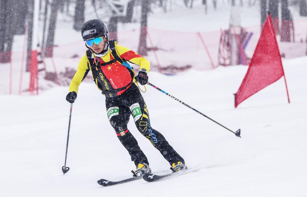 中国滑雪登山运动员玉珍拉姆在新疆富蕴县可可托海国际滑雪度假区进行的全国首届滑雪登山冠军赛短距离(女子组)比赛中。(2023年4月8日摄)。新华社记者 胡虎虎 摄