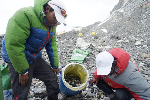 图为西藏拉萨喜马拉雅登山向导学校的向导们在珠峰进行垃圾清理(2016年5月21日摄)。 新华社发(扎西次仁摄)