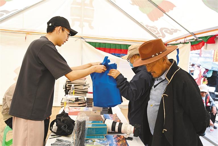 相关单位工作人员正在向群众发放非遗宣传资料。记者 杨子彦 扎西顿珠