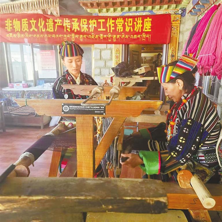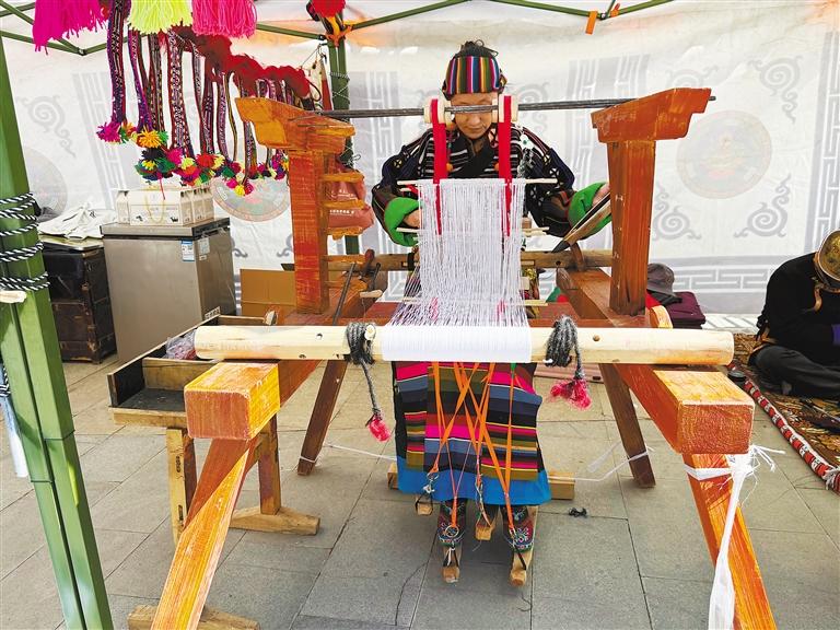 在措美县非遗展示活动现场,扎杂村村民在演示织氆氇。