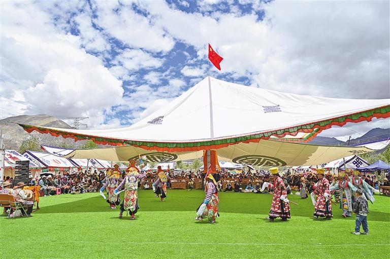 图为7月16日,民间藏戏表演队在南木林县非遗公园内表演湘巴藏戏。新华社记者 李鑫 摄
