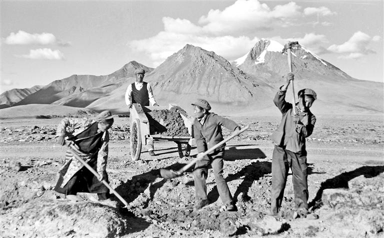 图为上世纪70年代,加加养护段养路职工战斗在雪山公路上(资料图片)。 苏远忠 摄
