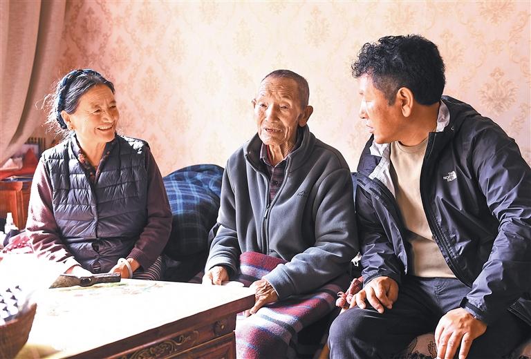 图为罗布多吉老人(中)与家人在一起。记者 旦增兰泽 洛桑 摄