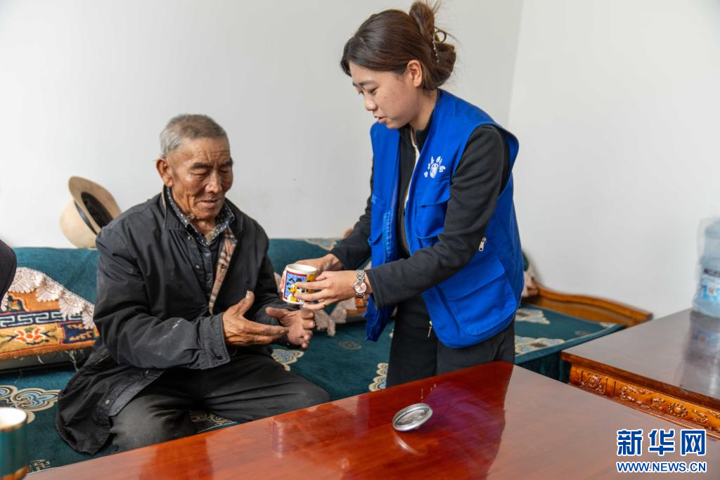 7月17日,在拉萨市曲水县三有村幸福驿站日间照料室里,志愿者为老人端茶。新华社记者旦增尼玛曲珠 摄