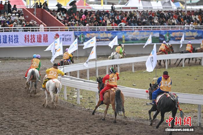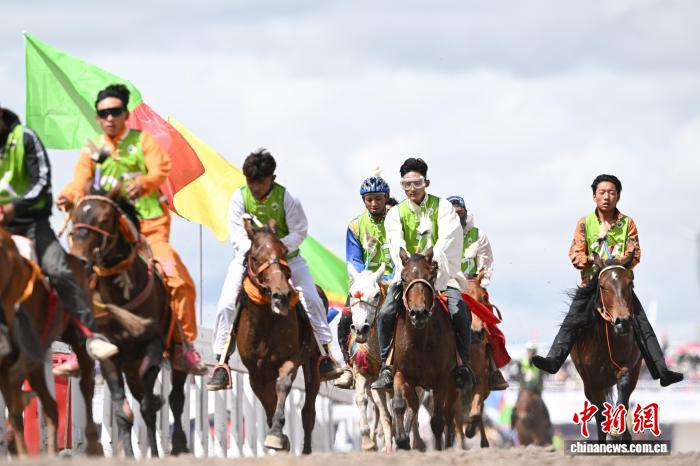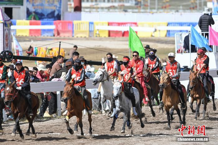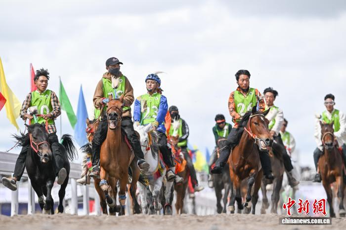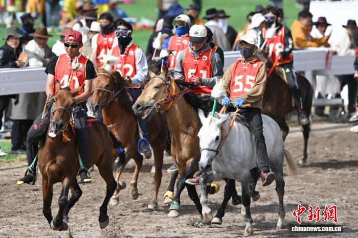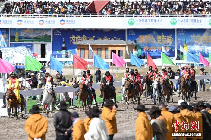 9月6日,西藏自治区那曲市恰青赛马节进入第二天,格萨尔赛马场赛事精彩不断。场内,1.38米以下小马展开10000米速跑、10000米走马、12000米走马决赛,1.38米以上1.45米以下大马角逐10000米速跑决赛。为观众带来速度与耐力的草原盛宴,尽显藏北草原赛马文化的独特魅力。图为1.38米以上1.45米以下大马速度赛比赛现场。中新社记者 贡嘎来松 摄