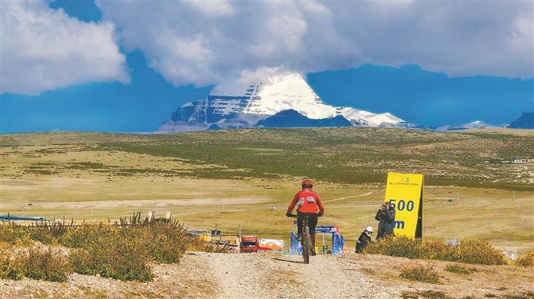 图为冈仁波齐峰前,选手在奋力骑行。记者 明吉 摄