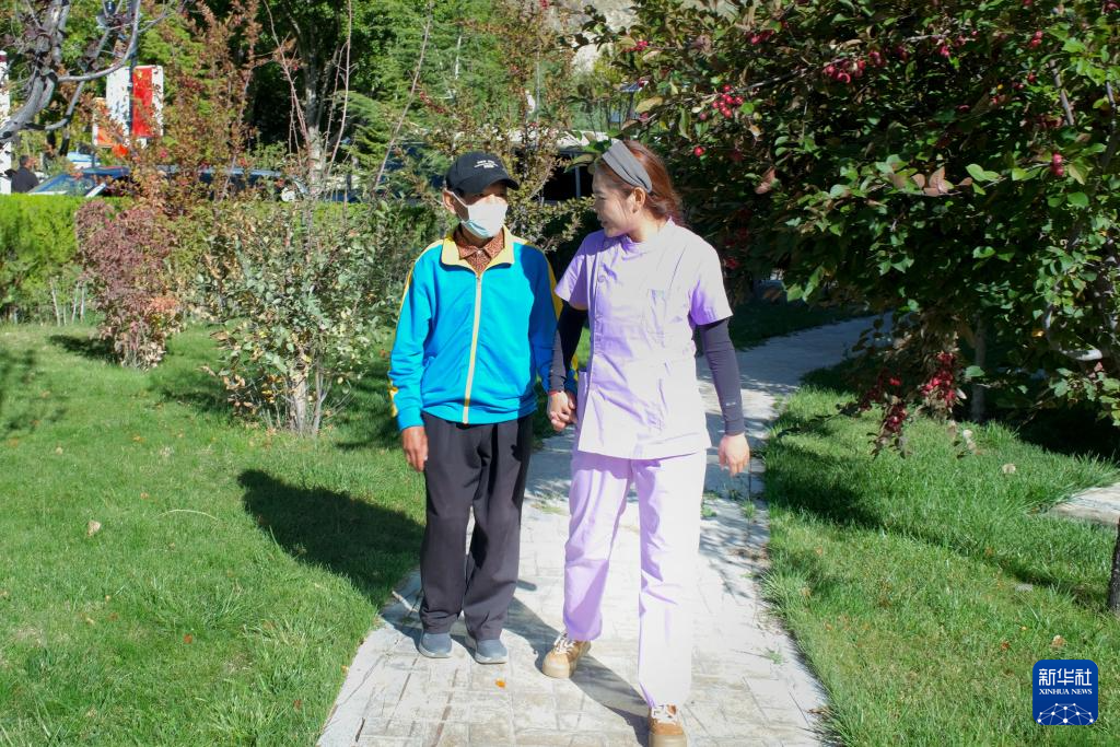 在西藏自治区残疾人托养服务中心,护理主管德吉(右一)带着拉玛散步(9月23日摄)。新华社记者周昱龙 摄