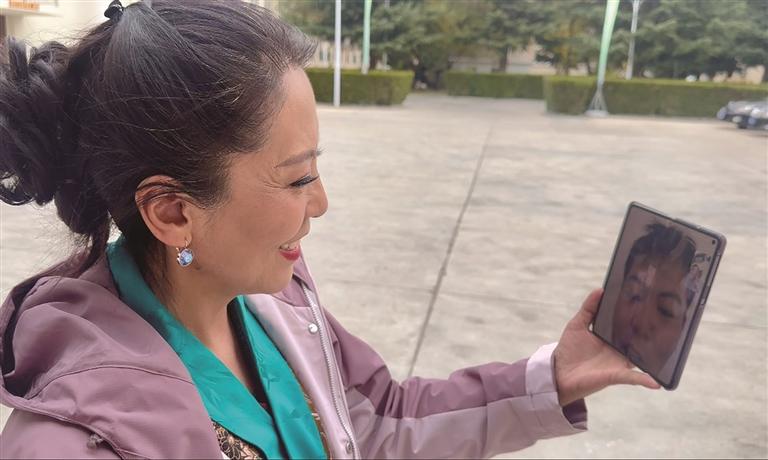 晋明吉措在工作之余与远在那曲的儿子视频聊天。图/记者 次仁旺姆