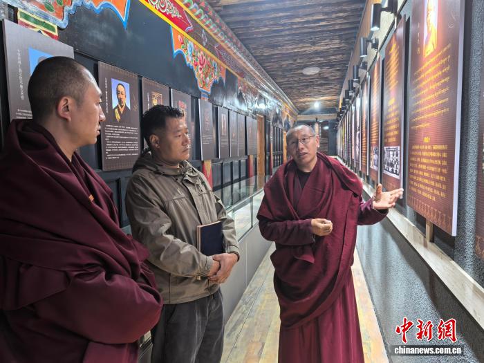 图为结古寺僧人顿珠才仁(右一)向参观者讲解展馆内容。中新网记者 胡贵龙摄