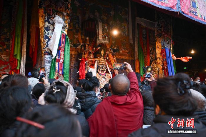 图为身着民族服装的信众在大昭寺内载歌载舞。中新社记者 贡嘎来松 摄