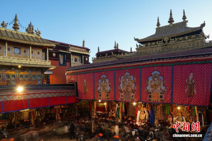 12月4日,藏历十月十五日,这一天是西藏的传统民俗节日“白拉姆节”,也被称为“仙女节”。当天信众们穿着节日盛装,手捧哈达、鲜花、水果、青稞酒等供品前往大昭寺,面对寺内的白拉姆和赤尊赞神像,双手合十虔诚地祈福并敬献供品,祈愿来年丰收、无灾无病。相传,白拉姆是拉萨地区的保护神,是藏传佛教最高护法神之一班丹拉姆的女儿。白拉姆曾与大昭寺护法神赤尊赞相互爱慕并私定终身,其母亲班丹拉姆发现后,赤尊赞被赶到拉萨河南岸,每逢藏历十月十五日,二人才能隔河相见一次。图为信众手捧哈达、青稞酒,在大昭寺内欢庆“仙女节”。贡确 摄