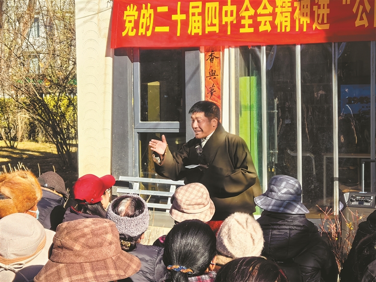 宗角禄康公园一角,宣讲员向群众宣讲党的二十届四中全会精神。