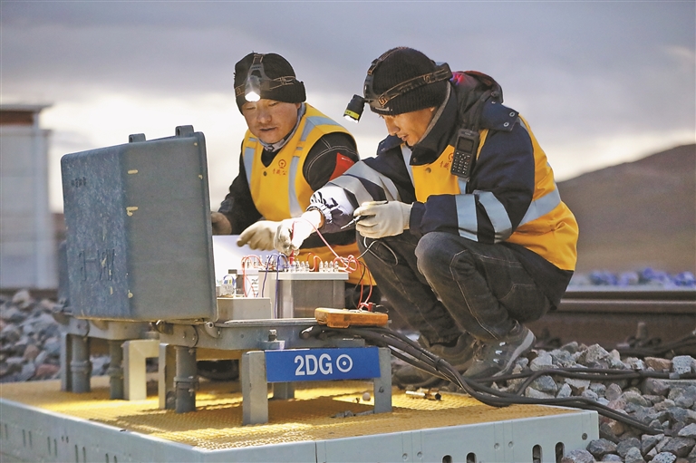 图为近日,中国铁路青藏集团有限公司拉萨基础设施段那曲信号车间扎加藏布信号工区职工在对信号机进行电气特性测试及数据记录。记者 旦增兰泽 通讯员 拉巴次仁 摄