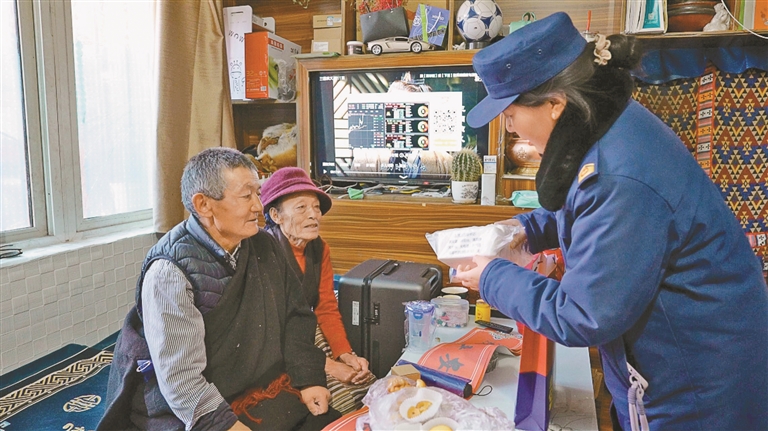 消防宣传员为独居老人送上消防主题春联和宣传品。陈来曲措 摄