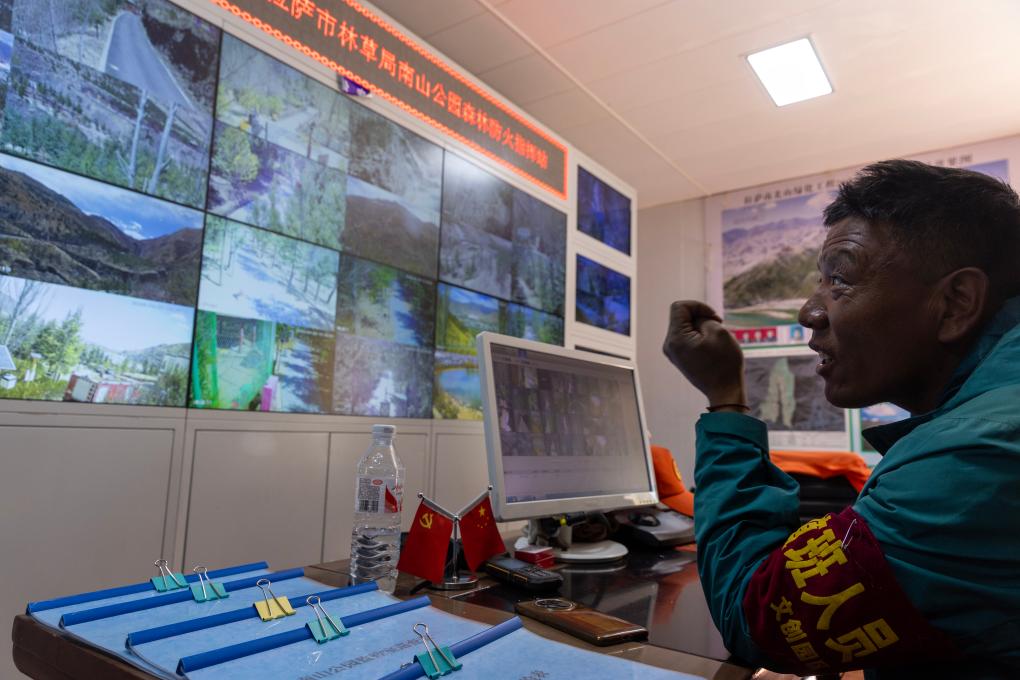 拉萨南山公园园区护林员扎西曲培正在监控室观察园区各处情况(3月20日摄)。新华社记者姜帆 摄
