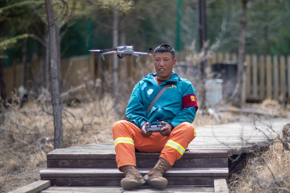 拉萨南山公园园区护林员扎西曲培正在操控无人机(3月20日摄)。新华社记者姜帆 摄
