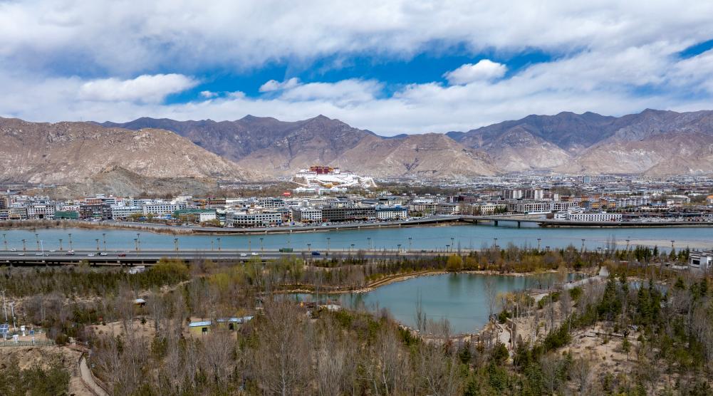 拉萨坐落于狭长的河谷地带,拉萨河蜿蜒穿城,两岸南山与北山连绵起伏。在布达拉宫正南方,绿色的南山与市区隔河相望,山间灌木与乔木错落有致,绿意盎然。
