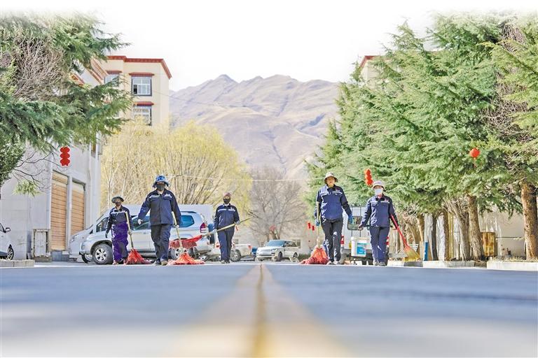 物业服务部保洁团队在清扫小区道路。记者 阿旺尼玛 摄