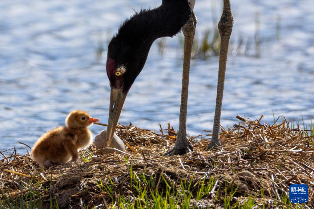 6月5日,一只黑颈鹤在那曲市申扎县的湿地上照顾前一天刚出壳的雏鸟。新华社记者 姜帆 摄