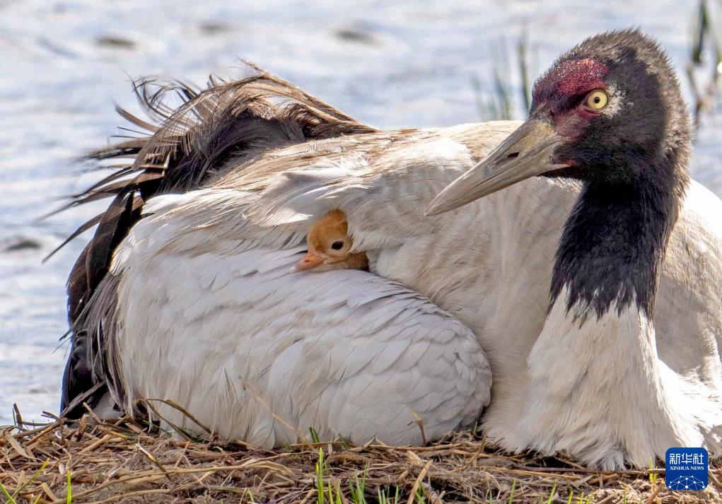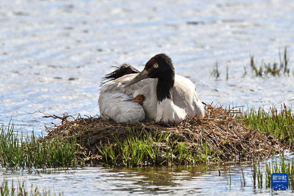 一对黑颈鹤在那曲市申扎县的湿地上照顾刚出壳的雏鸟,一只将其护在身下保持温暖,另一只则在旁保持警戒(6月4日摄)。新华社记者 姜帆 摄