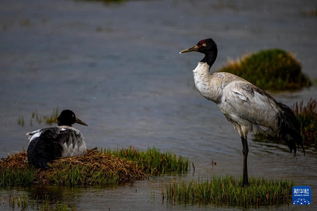 6月4日拍摄的在那曲市申扎县周边湿地里栖息的黑颈鹤。新华社记者 旦增尼玛曲珠 摄