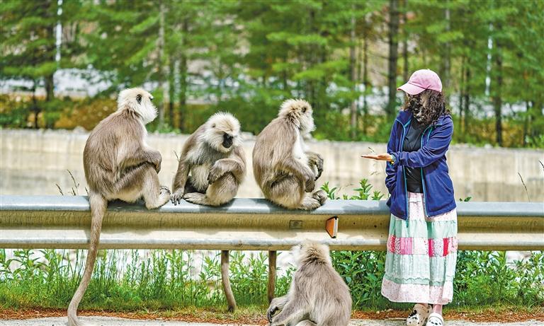 图为6月20日,在亚东县一条公路边,游客在和长尾叶猴互动。新华社记者 丁增尼达 摄