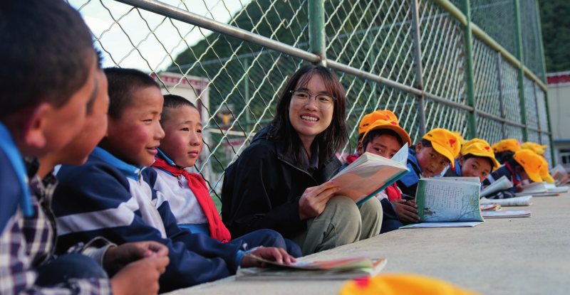 在西藏林芝市工布江达县娘蒲乡中心小学,岭南师范学院支教队队员涂建枝在晚自习前和孩子们一起温习功课(2024年9月3日摄)刘洲鹏摄/本刊