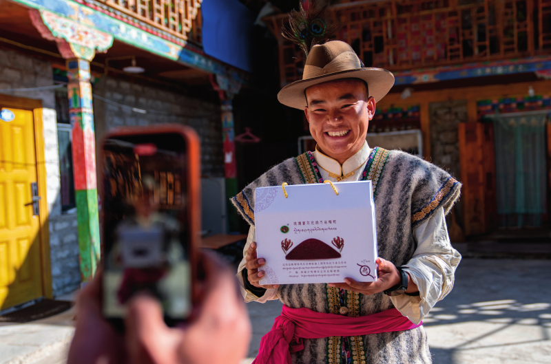在西藏日喀则市定结县陈塘镇,自媒体博主夏尔巴人旦增在拍摄视频推介当地特产鸡爪谷糌粑(2024年12月13日摄)丁增尼达摄/本刊