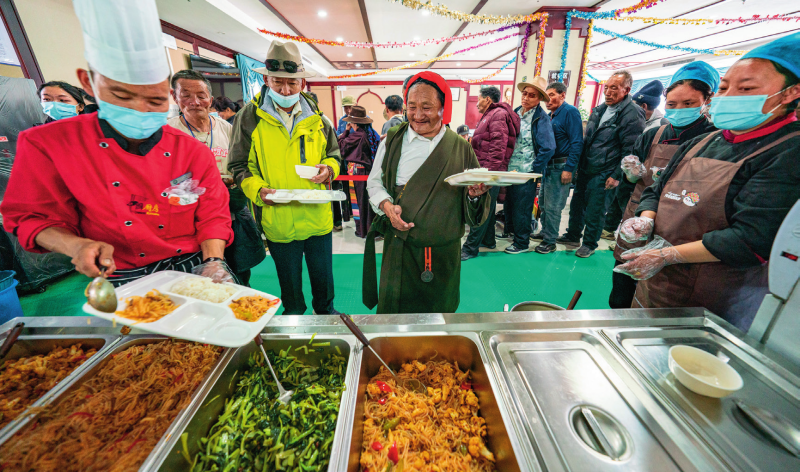 在西藏那曲市色尼区老年人日间照料中心,老人们在排队打饭(2025年4月25日摄)丁增尼达摄/本刊