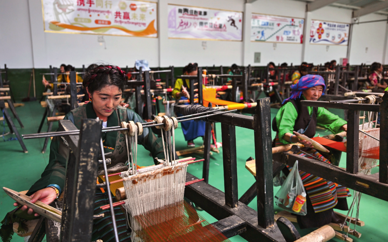 在西藏日喀则市仁布县特色产业孵化园,亚德细褐羊毛织品农民专业合作社工作人员在车间里织布(2024年9月1日摄)孙瑞博摄/本刊