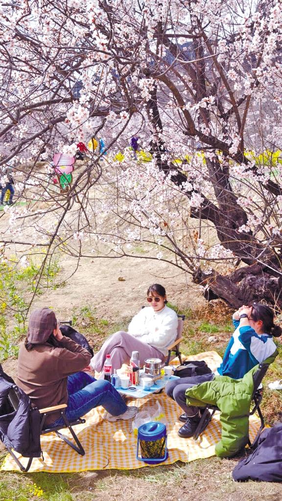 群众在林芝市巴宜区林芝镇嘎拉村的桃花树下过林卡。记者 央拉 摄