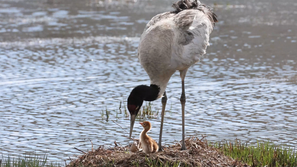 说到这里,次成塔青突然转过身,看向高高丽丽和它们的孩子。开始下雨了,水面上铺满了细密的涟漪,而在湿地中央那一个不大的巢上,是一动不动、用身子紧紧护住孩子的黑颈鹤。看着这一幕,风雨似乎也没有那么刺骨了……