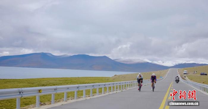图为9月7日,参赛选手在海拔超过5000米的西藏普莫雍措湖畔骑行。(浪卡子县融媒体中心供图)