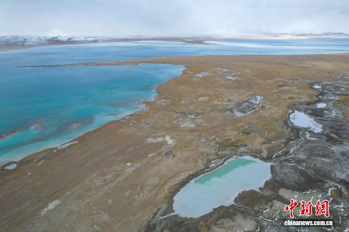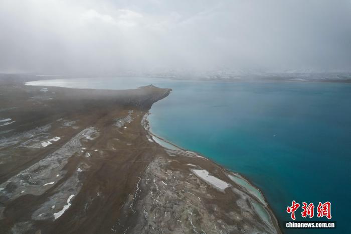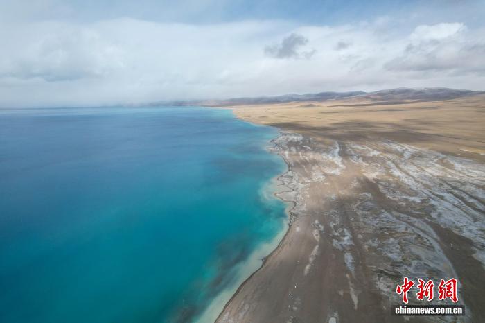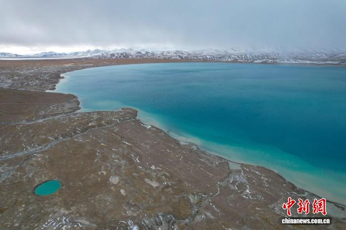 美马错位于西藏自治区阿里地区日土县与改则县交界处,湖面海拔4920米,面积140.5平方公里。据悉,该湖地处昆仑山南麓。近日,中新网记者自驾新藏公路北线途经该湖,航拍画面显示,湖泊呈带状铺展,湖水自岸边向中心颜色渐次加深,远处与天色交融成墨绿。周边群山覆雪,湖泊、荒滩、雪山构成一幅天地共绘高原蓝的美丽景象。图为10月9日,美马错与远处的雪山。江飞波 摄