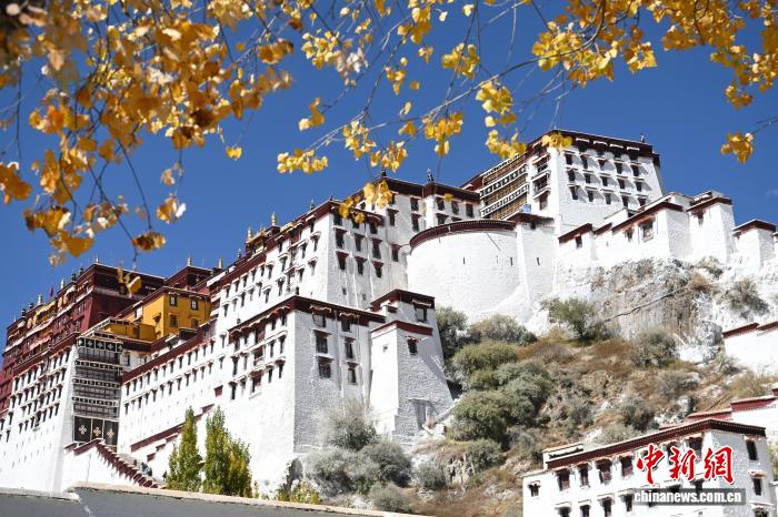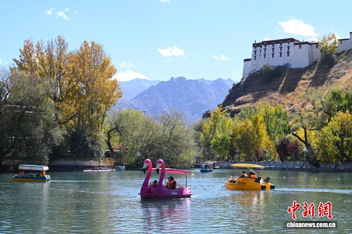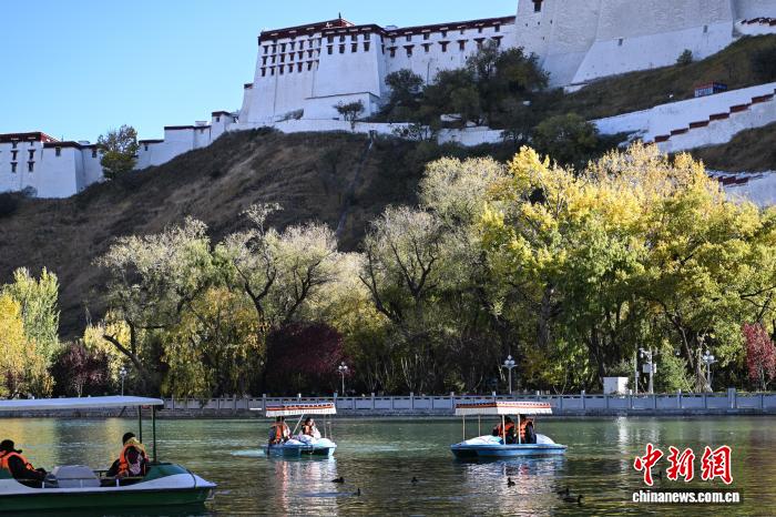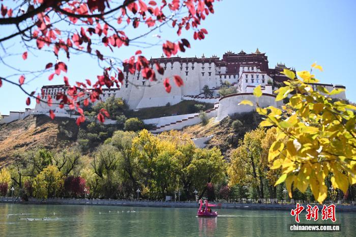 10月25日,金秋时节,西藏拉萨市宗角禄康公园进入最佳观赏期。人工湖畔杨树、柳树褪去翠绿,换上金黄与橙红的盛装,倒映在澄澈湖水中,与布达拉宫的红墙白宫相映成趣。中新社记者 贡嘎来松 摄