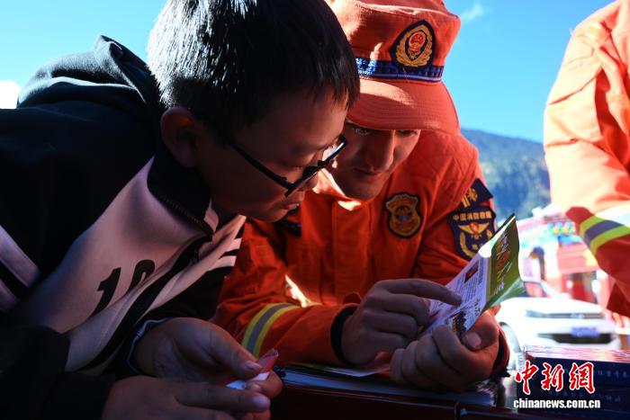 图为指战员给小朋友讲解防火知识。仁青旺堆 摄