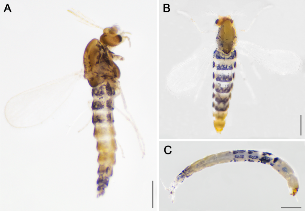 图为墨脱流施密摇蚊整体照:A为雄成虫、B为雌成虫、C为幼虫。(西藏自治区高原生物研究所“达娃创新工作室”供图)